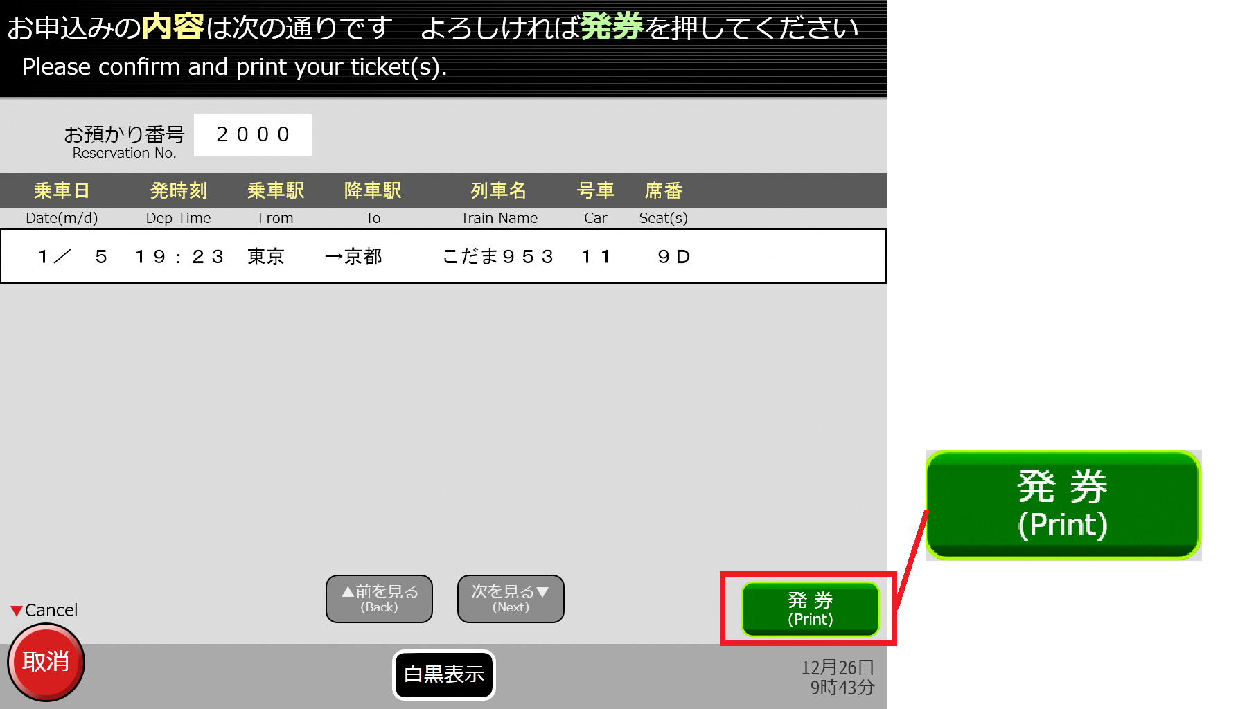 JR乗車票受取コード確認コード表示(JR boarding pass receipt code/confirmation code display) button - A Platt Kodama ticket's pickup QR Code and confirmation 6-digit code will be displayed